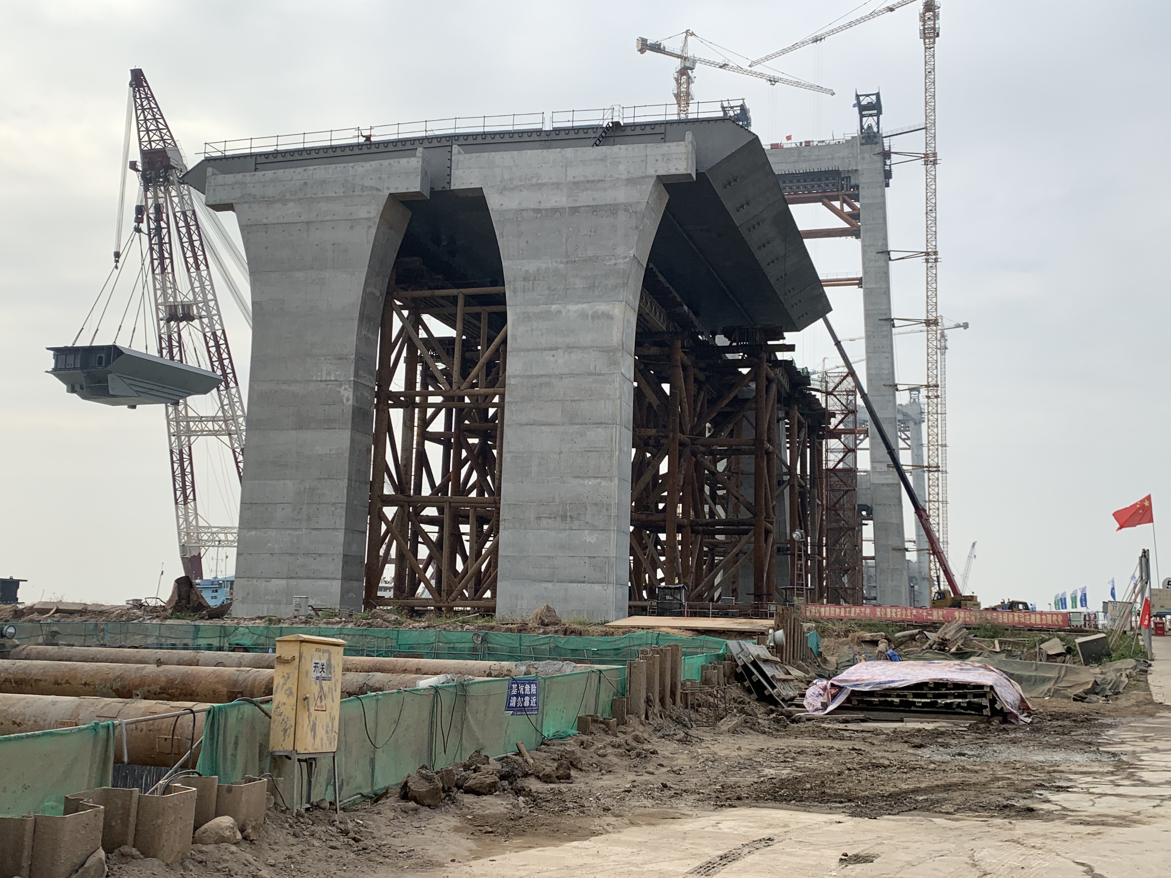首先,大家前往东江南支流港湾大桥项目地进行参观学习。通过中交二航局项目经理游川的详细讲解,我们了解到本项目主桥为主跨320m的自锚式悬索桥,跨度居国内前列,首次采用“临时锚碇法”进行主桥上部结构“先缆后梁”施工,解决了自锚式悬索桥“先缆后梁”施工的诸多技术难题,为我国桥梁工程施工建设提供了重要理论依据和实用技术。作为项目监理方,我们的监理技术和手段随着施工工艺的更新而不断迭代升级,为项目建设质量保驾护航。“一桥飞架南北,天堑变通途”,作为项目建设者,我们倍感骄傲!