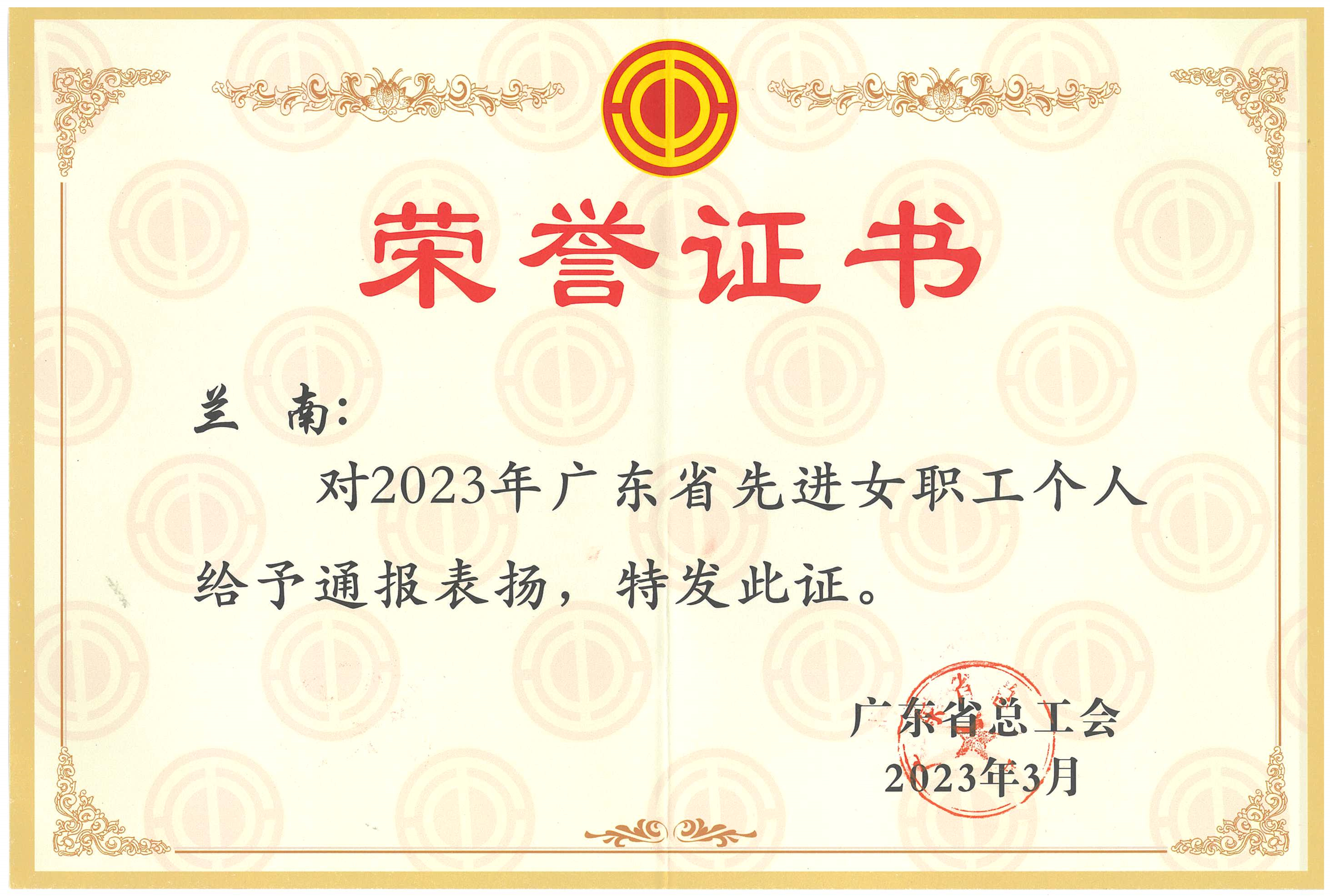 集团九域公司总工程师兰南获广东省总工会授予 “2023年广东省先进女职工个人”荣誉称号