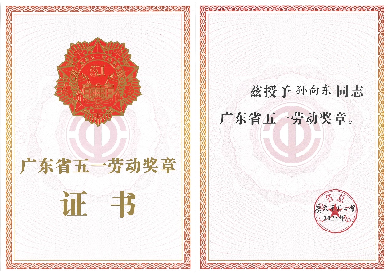 近日,为表彰先进,树立典型,弘扬劳模精神、劳动精神、工匠精神,广东省总工会发布2024年广东省五一劳动奖状、奖章和工人先锋号表彰名单。公司总工程师孙向东荣获“广东省五一劳动奖章”荣誉称号。