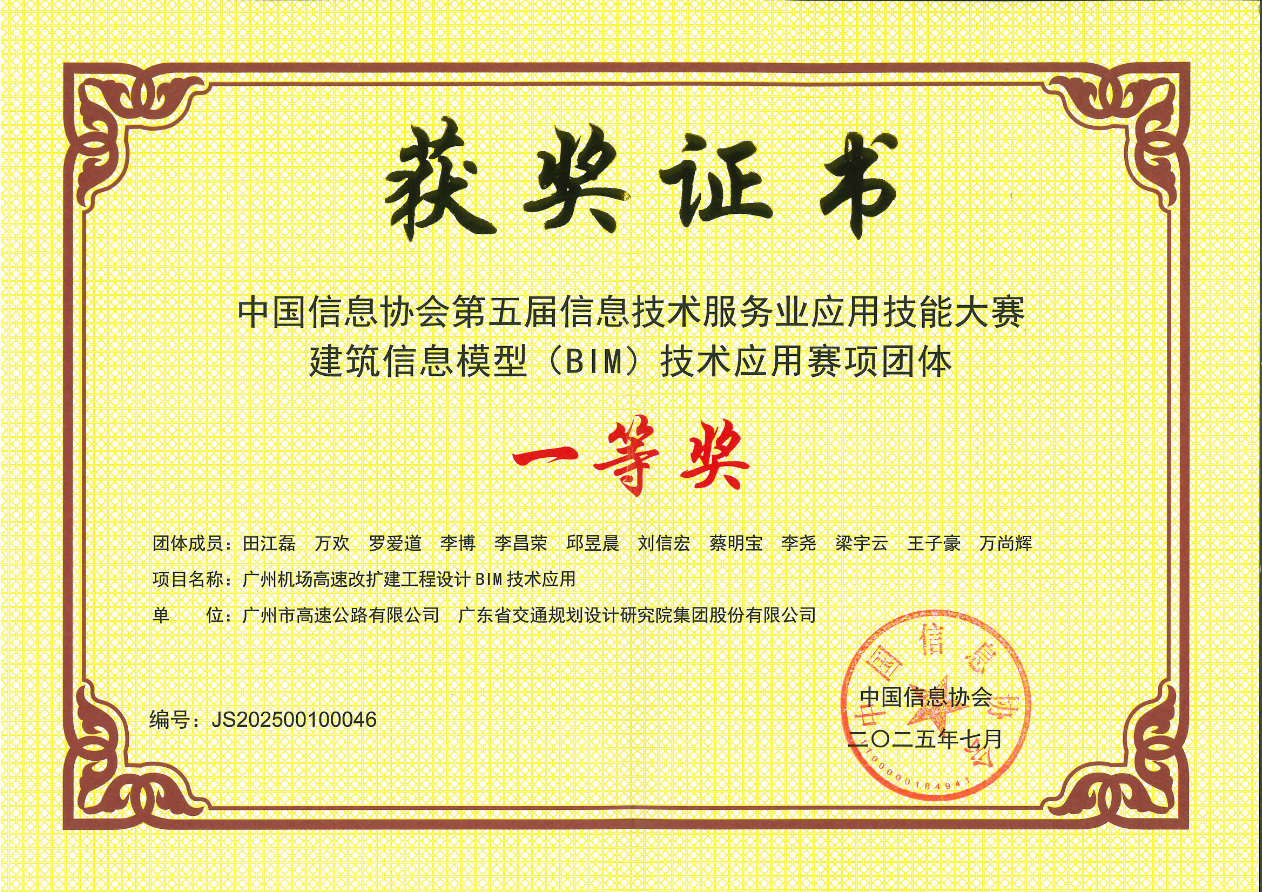 7月21日,2025年度中国信息协会第五届信息技术服务业应用技能大赛颁奖典礼在北京隆重召开。经过选拔赛、决赛和专家审议复查,公司《广州机场高速改扩建工程设计BIM技术应用》项目从全国各工程行业900余个BIM参评项目的激烈竞争中脱颖而出,荣获一等奖。