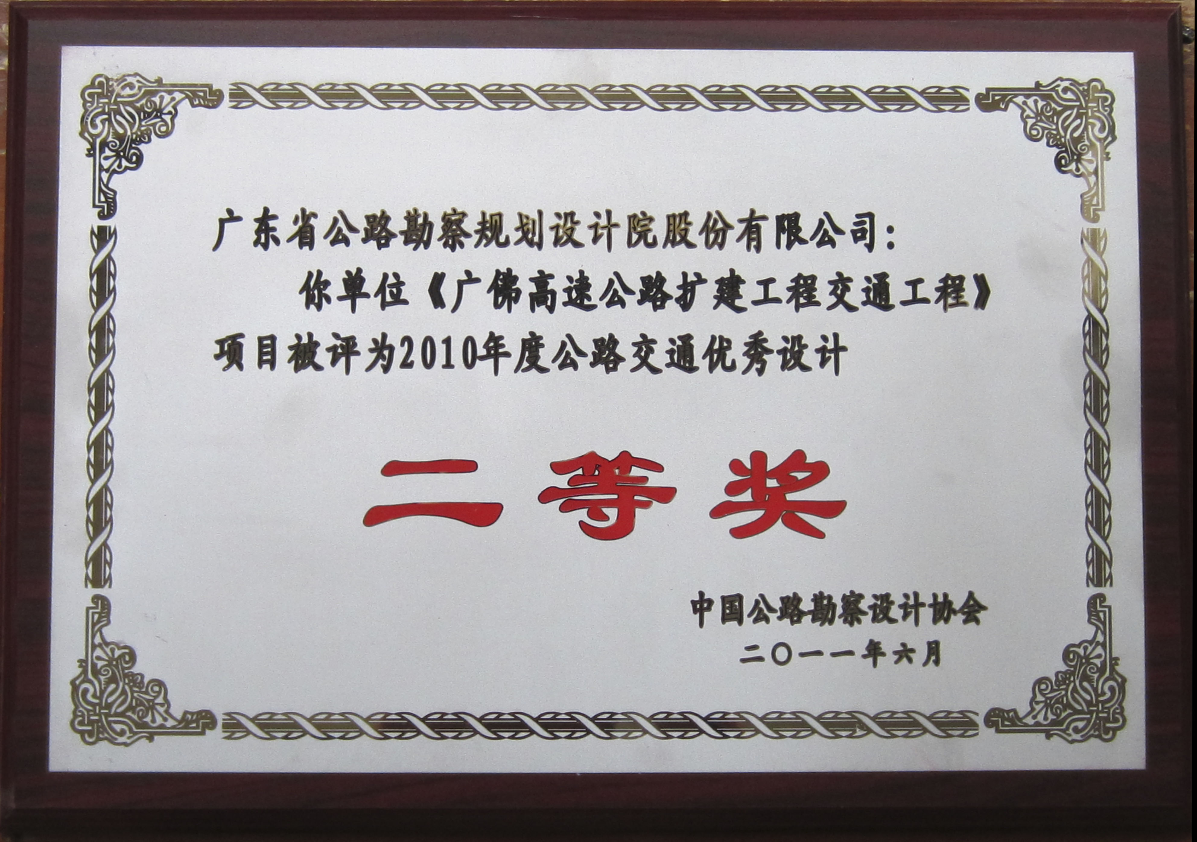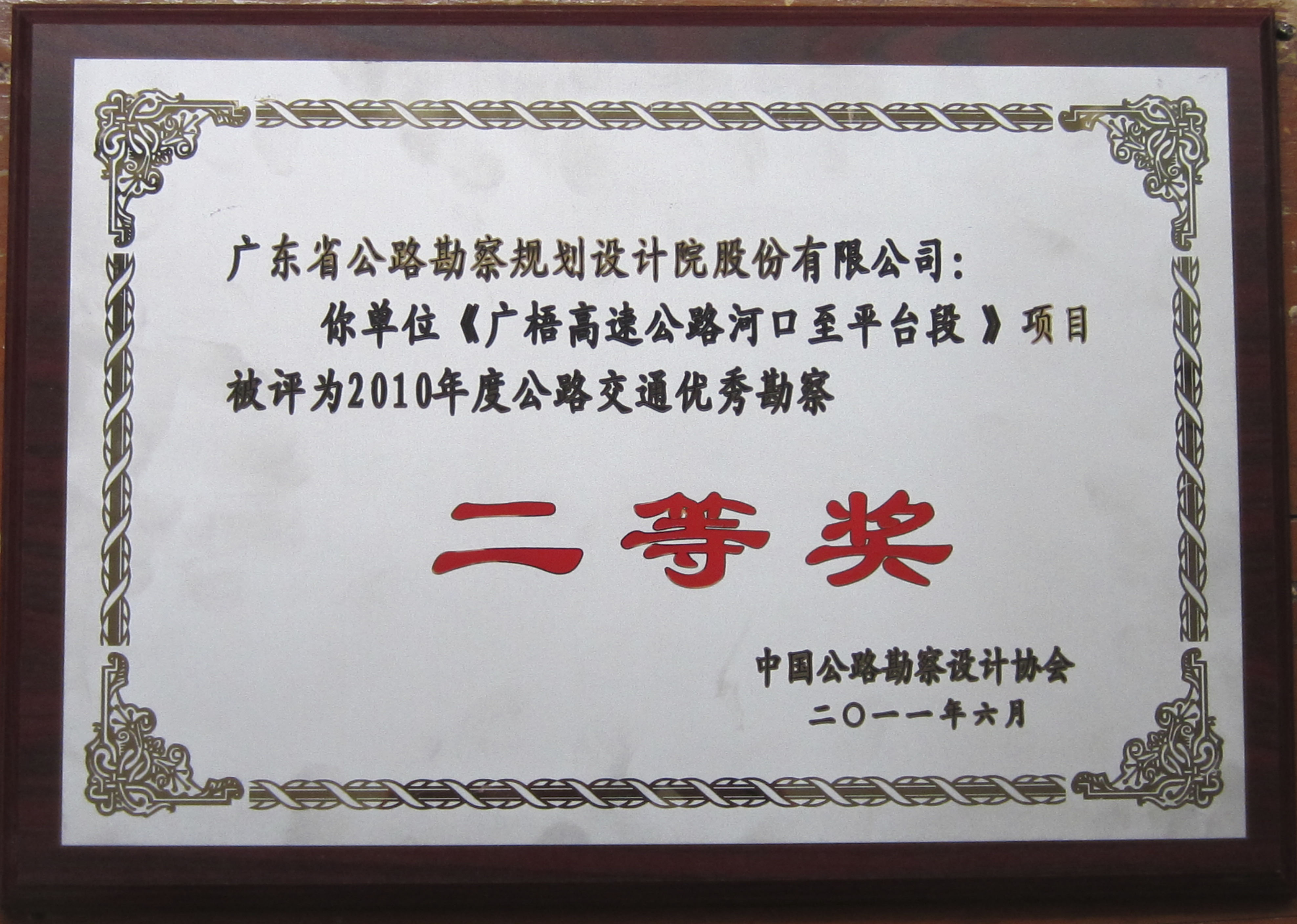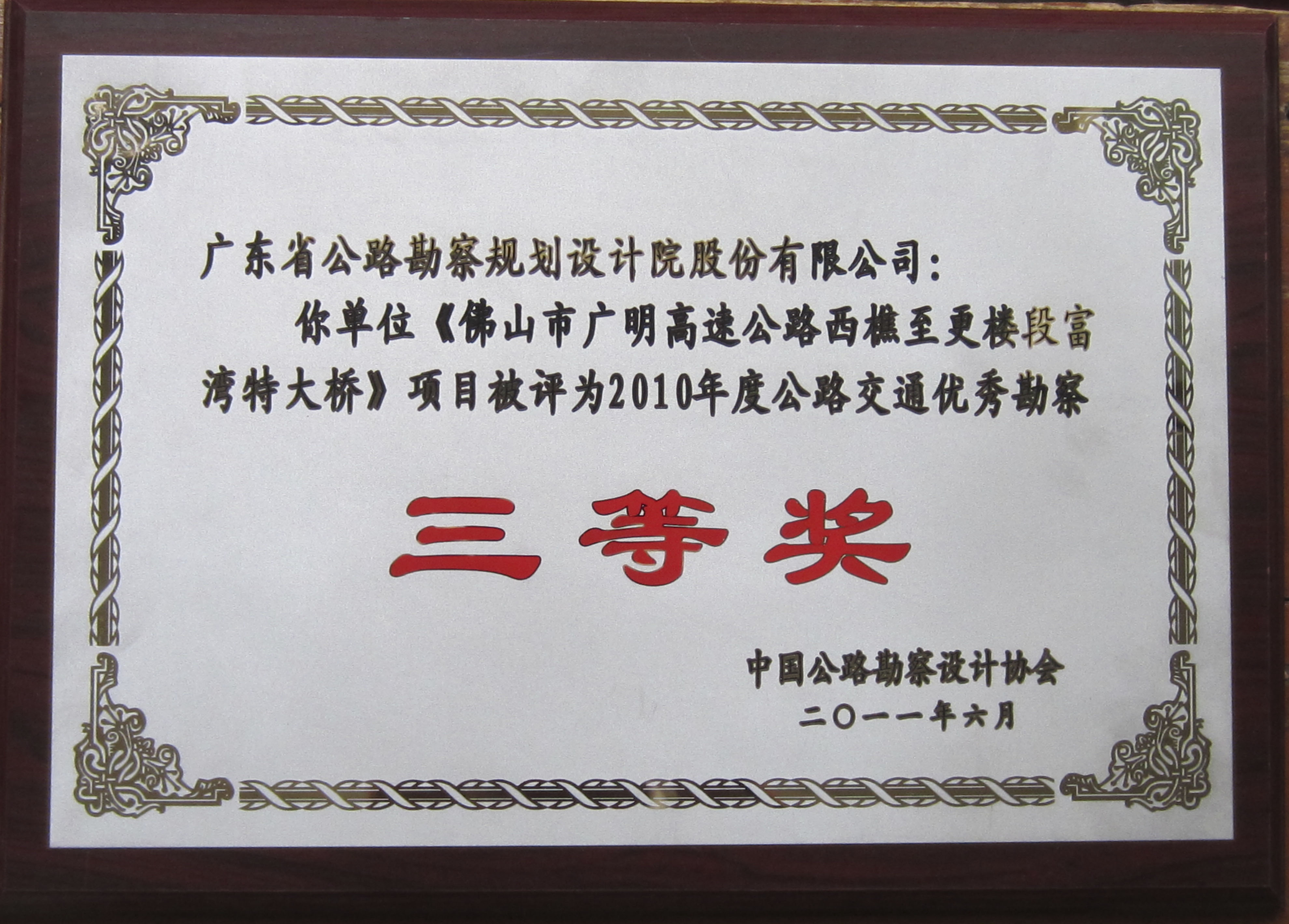 热烈祝贺: 公司五个项目分别荣获“2010年度公路交通优秀勘察设计奖” 一、2010年度公路交通优秀设计奖 一等奖:广梧高速公路河口至平台段 二等奖:广佛高速公路扩建工程交通工程 三等奖:佛山市广明高速公路西樵至更楼段富湾特大桥 二、2010年度公路交通优秀勘察奖 二等奖:广梧高速公路河口至平台段 三等奖:佛山市广明高速公路西樵至更楼段富湾特大桥