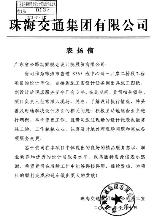 近日,珠海交通集团有限公司发专函表扬我司在省道S365线中心涌至井岸二桥段工程中提供的的技术服务,对我司的精品服务意识、员工职业素养和优秀的设计与服务水平给予了充分肯定。该项目由市政与交通工程设计部承担。