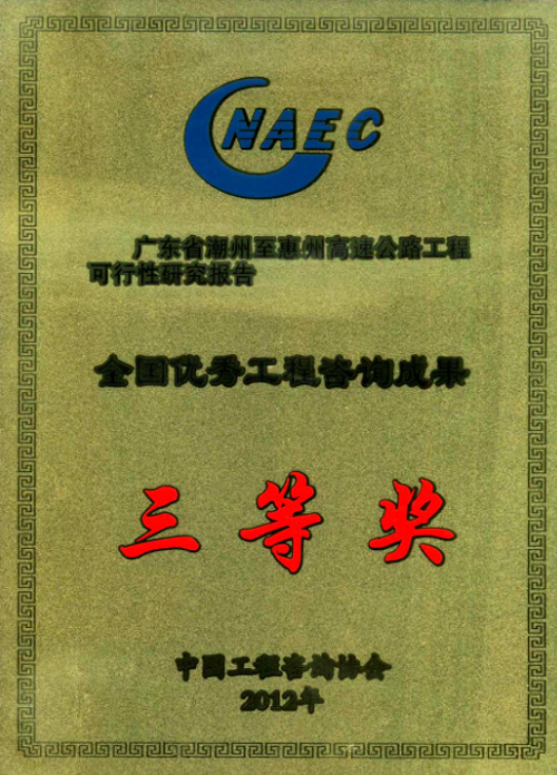 1、广东省潮州至惠州高速公路工程可行性研究报告荣获三等奖