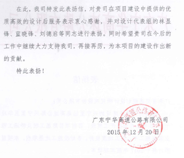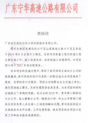 近日,广东宁华高速公路有限公司发来表扬信,对我司在兴宁市至汕尾高速公路兴宁至五华段项目中提供的优质、高效的设计后服务表示赞扬,同时对负责该项目的第二路桥设计分公司等组织和个人给予了通报表扬。特此报喜。