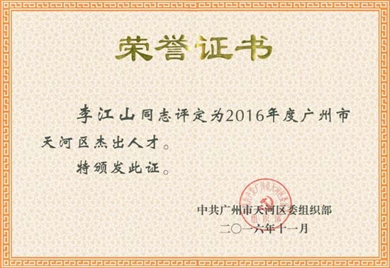 热烈祝贺李江山董事长荣获“2016年度广州市天河区杰出人才”称号
