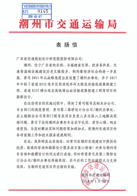 近日,潮州市交通运输局发来表扬信,对我司在潮州市承担的多个项目勘察设计工作及后服务表示肯定,肯定我司不断深入市场一线,秉承专业、高效、负责的工作态度,提供高效、优质的设计后服务,为潮州市交通建设的发展作出了积极贡献。同时,对负责该项目的第二路桥设计分公司潮州办事处及相关项目人员给予了通报表扬。特此报喜!