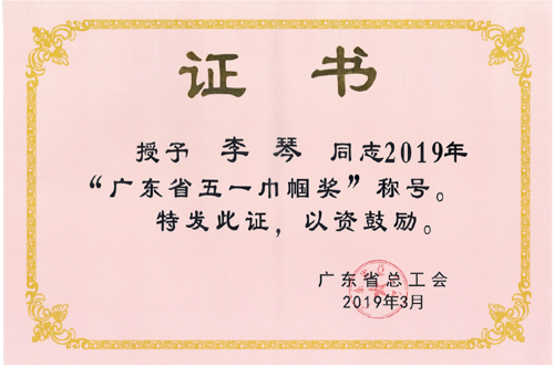 近日,从广东省总工会传来喜讯,我公司党委副书记、副总经理、工会主席、女职工委主任李琴女士喜获“广东省五一巾帼奖”荣誉称号,特此报喜。
