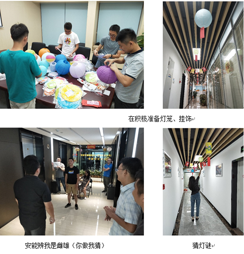 天花板下悬挂了一串串灯笼和灯谜;在办公区的4个方位还设置了“月兔蹴鞠”“月兔归巢”“安能辨我是雌雄”以及指压板跳绳等游戏区和兑奖区,吸引大家参与其中。节日的气氛洋溢在现场的每个角落。赢取到游戏中的精美礼品的大伙儿满载而归,在欢声笑语中提前度过了一个快乐而有意义的中秋佳节。
