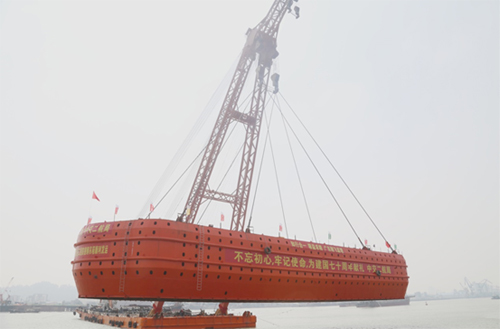 东江南支流港湾大桥主墩承台防撞套箱,采用固定式释能附体型结构。钢套箱长73.12米、宽23.8米、高9.5米,重量约1100吨,正常使用寿命为30年。本次下放的钢套箱为主桥25#墩。大桥所在的东莞水道为5000吨级海轮航道,桥位区域河流航道繁忙,船舶流量约每天400艘次,钢套箱下放施工难度大,通航安全风险极高。