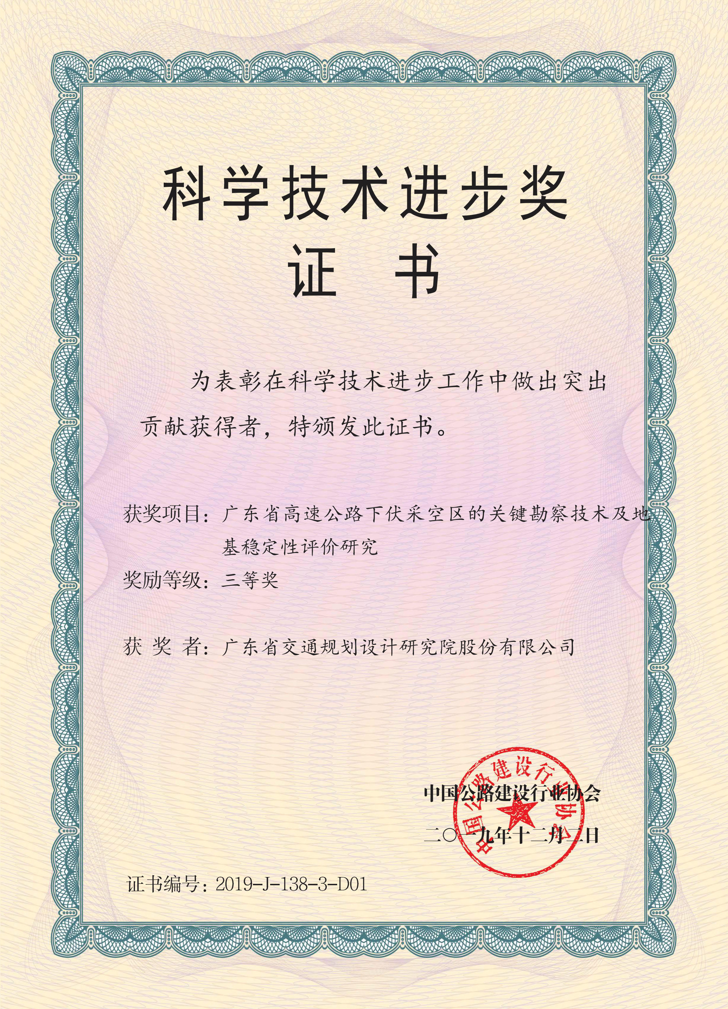 3.“广东省高速公路下伏采空区的关键勘察技术及地基稳定性评价研究”荣获三等奖,承担部门为岩土勘察分院。