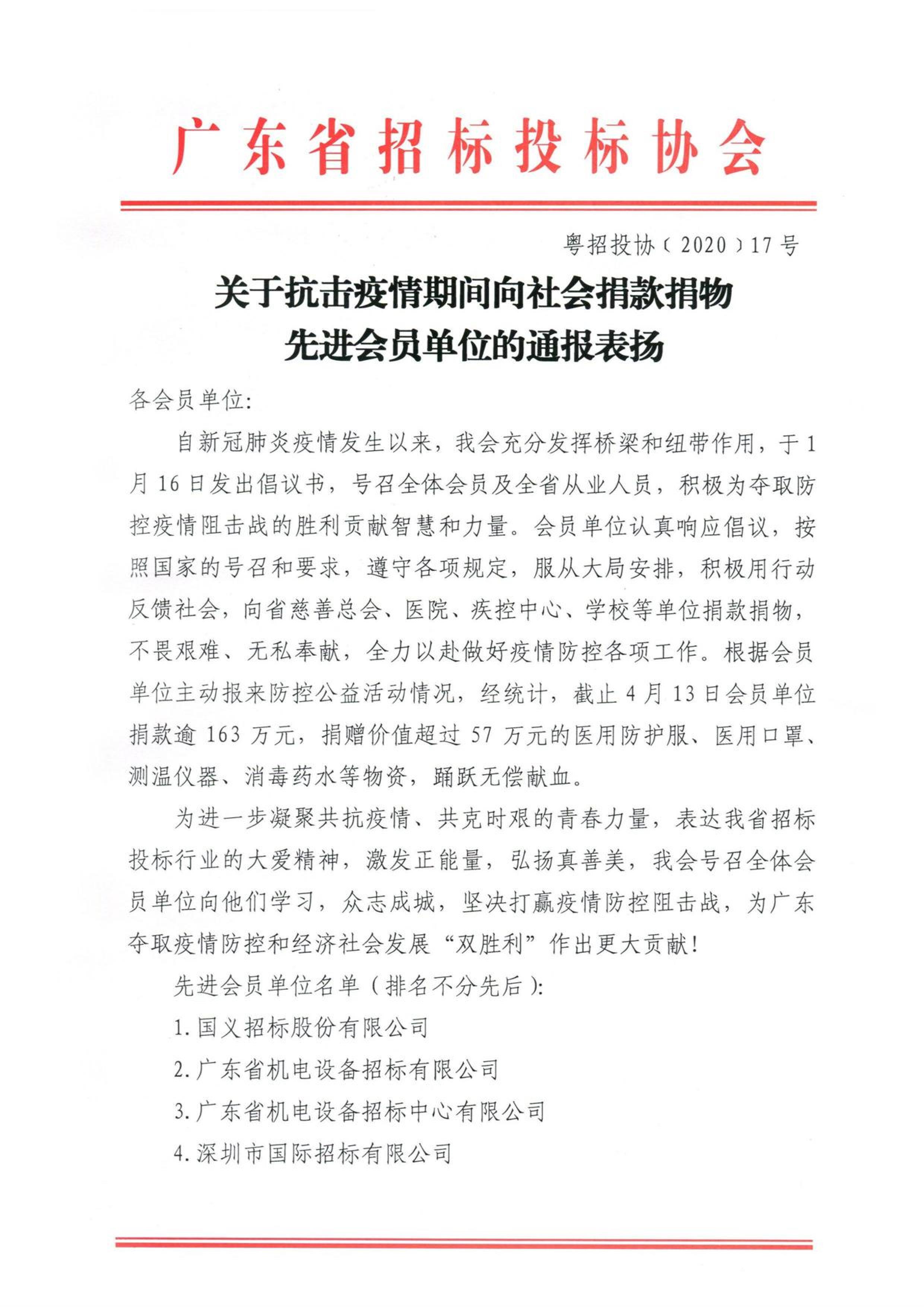 近日,我公司及员工在抗击疫情期间踊跃捐款、献血奉献爱心,积极用行动为抗疫贡献力量,公司获得了广东省招标投标协会的通报表扬。